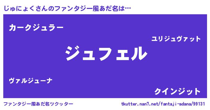 | 男性向けラノベタイトル風あだ名 | 『じゅにょくの憂鬱』『緋弾のジュニョク』 |