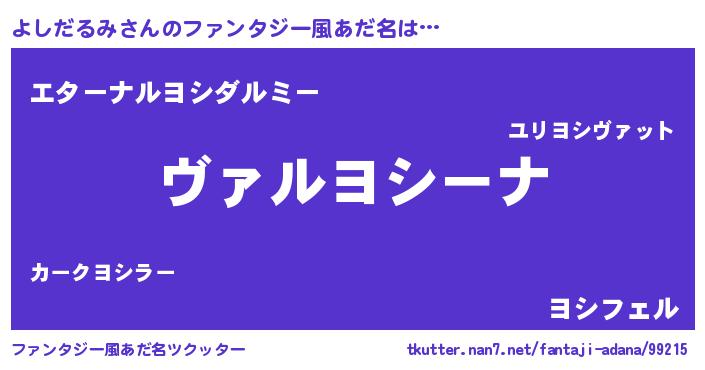 | 女子向けラノベタイトル風あだ名 | 『乙女ゲームの破滅フラグしかない悪役よしだるみに転生してしまった…』 |