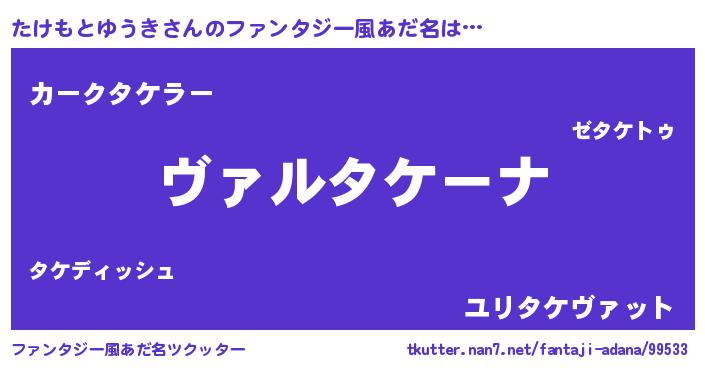 | 男性向けラノベタイトル風あだ名 | 『魔弾の王とたけもとゆうき』 |