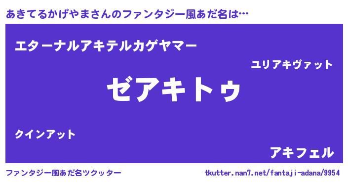 | 男性向けラノベタイトル風あだ名 | 『あきてるかげやまに滅ぼされるだけの簡単なお仕事です』 |