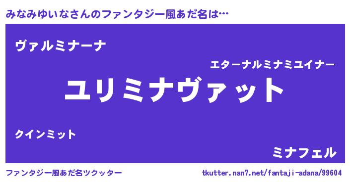 | 男性向けラノベタイトル風あだ名 | 『ミナミユイナスレイヤー』 |