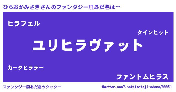 | 男性向けラノベタイトル風あだ名 | 『ひらおかみさき~年齢イコール彼女いない歴の魔法使い~』 |