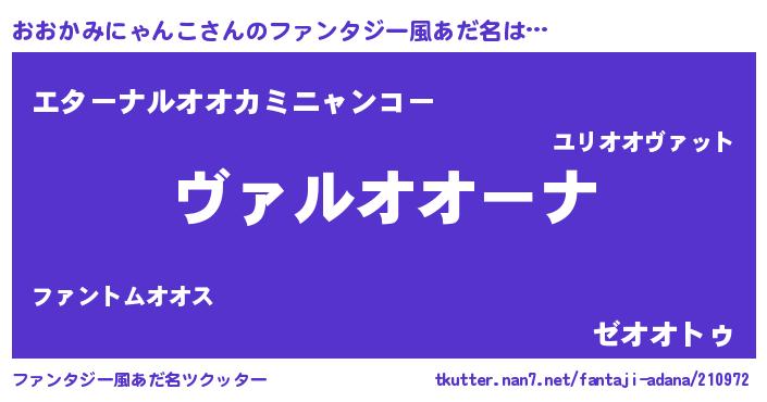 | 男性向けラノベタイトル風あだ名 | 『この素晴らしい世界におおかみにゃんこを!』 |