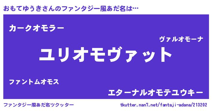 | 男性向けラノベタイトル風あだ名 | 『おもてゆうき~年齢イコール彼女いない歴の魔法使い~』 |