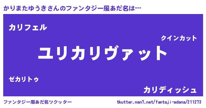 | 男性向けラノベタイトル風あだ名 | 『かりまたゆうき~年齢イコール彼女いない歴の魔法使い~』 |
