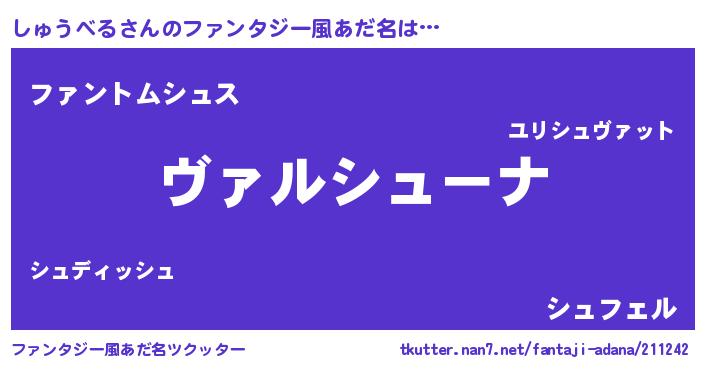 | 男性向けラノベタイトル風あだ名 | 『魔弾の王としゅうべる』 |