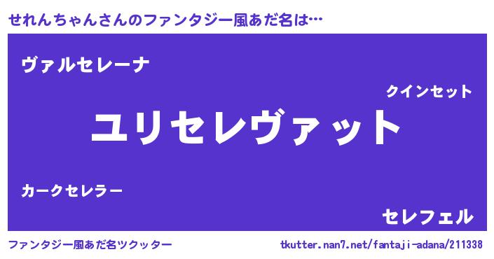 | 男性向けラノベタイトル風あだ名 | 『せれんちゃん~年齢イコール彼女いない歴の魔法使い~』 |