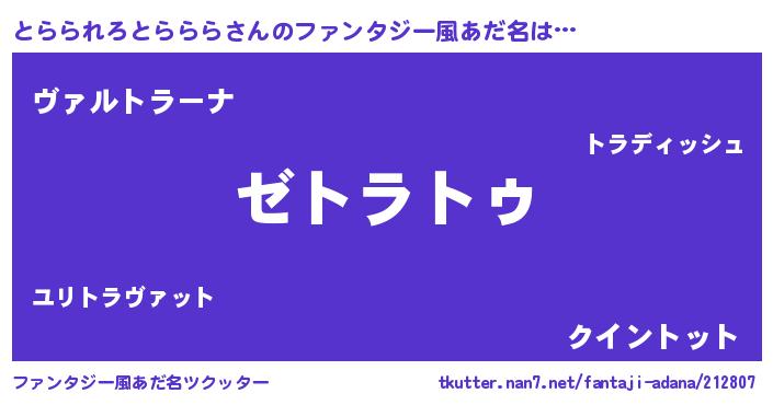 | 女子向けラノベタイトル風あだ名 | 『とらられろとらららなんてお断りですっ。』 |