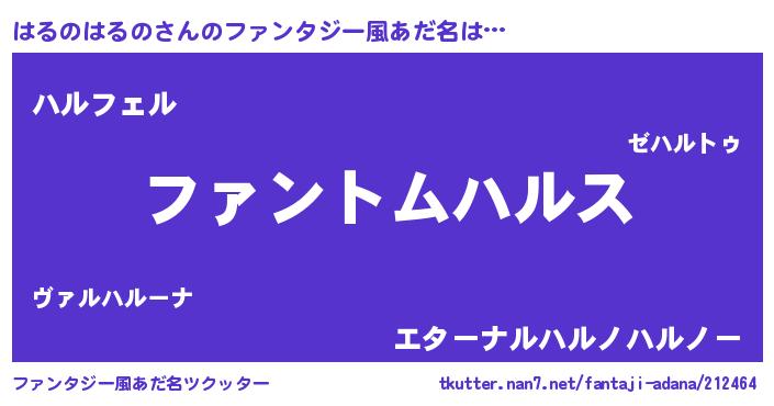 | 男性向けラノベタイトル風あだ名 | 『はるのはるのの嫁は女の子じゃないと思った?』 |