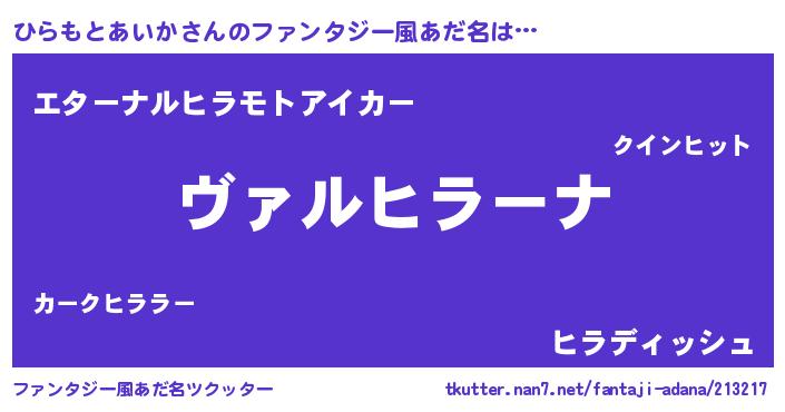 | 男性向けラノベタイトル風あだ名 | 『魔弾の王とひらもとあいか』 |