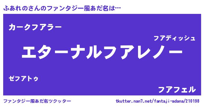 | 女子向けラノベタイトル風あだ名 | 『ふあれのの雑貨屋さん』 |