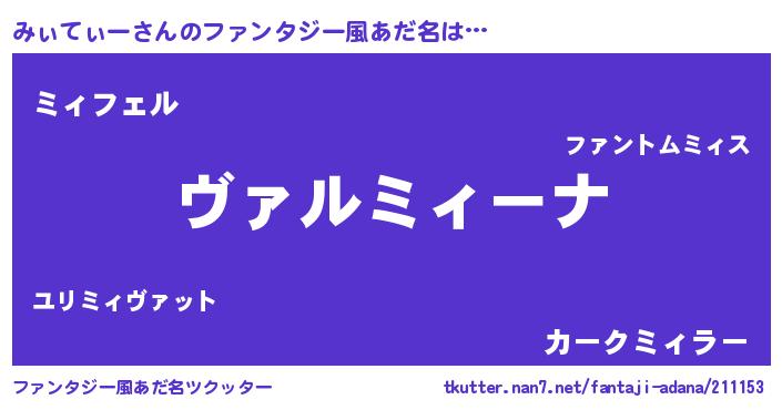 | 男性向けラノベタイトル風あだ名 | 『魔弾の王とみぃてぃー』 |