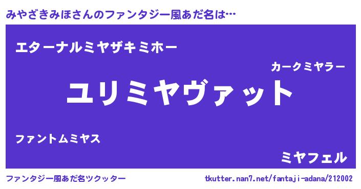 | 男性向けラノベタイトル風あだ名 | 『ミヤザキミホスレイヤー』 |