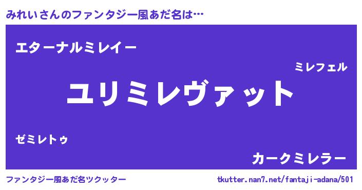 | 女子向けラノベタイトル風あだ名 | 『みれいの玉の輿計画!』 |