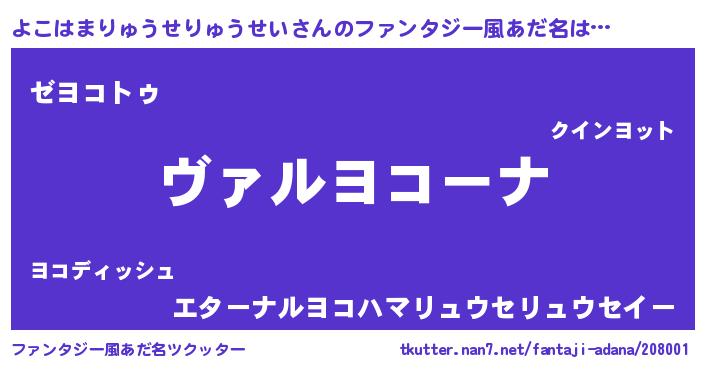 | 男性向けラノベタイトル風あだ名 | 『魔弾の王とよこはまりゅうせりゅうせい』 |