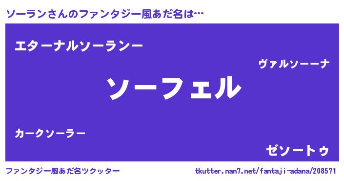 | 男性向けラノベタイトル風あだ名 | 『ソーランの憂鬱』『魔弾の王とソーラン』 |
