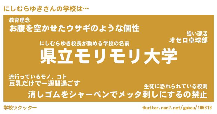 | ヒーロー風カッコイイあだ名 | 『スーパーニシムラユキ』『暗黒騎士ニシ』 |