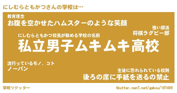 | 男性向けラノベタイトル風あだ名 | 『にしむらともかつの憂鬱』 |