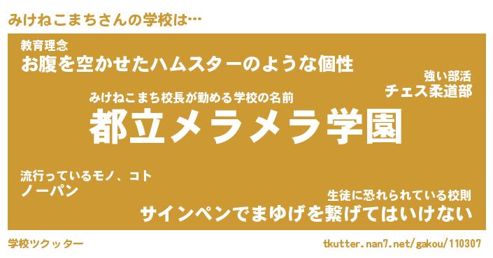 | 男性向けラノベタイトル風あだ名 | 『みけねこまちの憂鬱』 |