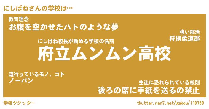 | 男性向けラノベタイトル風あだ名 | 『にしばねの憂鬱』 |