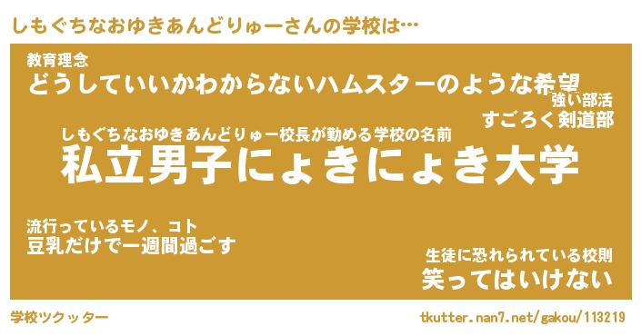 | 男性向けラノベタイトル風あだ名 | 『しもぐちなおゆきあんどりゅーの憂鬱』 |