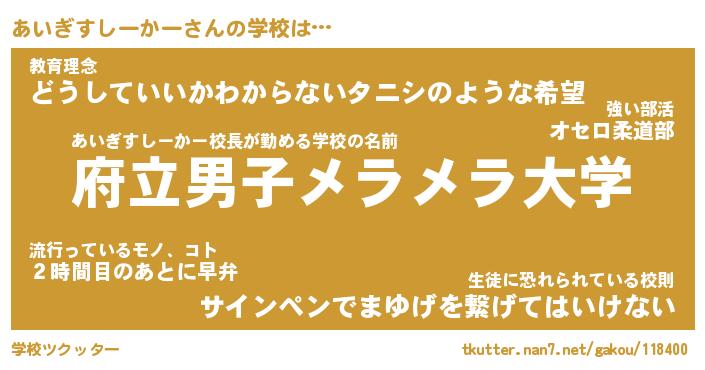 | 病院 | あいぎすしーかー院長の病院名『都立黒光り大学病院』 |