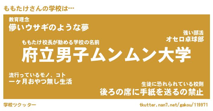 | 意味不明あだ名 | 『ペロリンももたけ』『永久保存ももたけ』 |