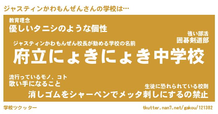 | 男性向けラノベタイトル風あだ名 | 『ジャスティンかわもんぜんの憂鬱』 |