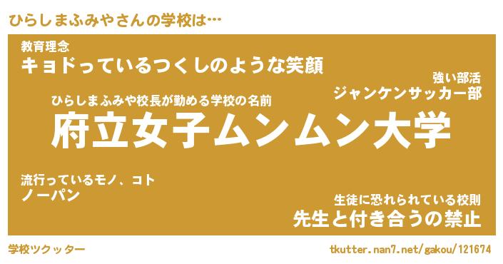| 恥ずかしいあだ名 | 『プリティーひらしまふみや』『ひらちん』 |
