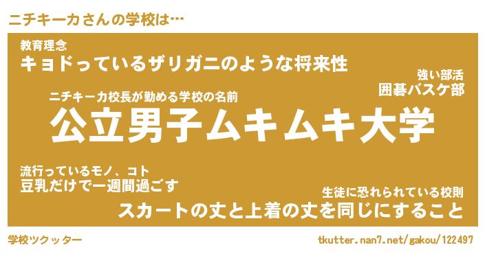 | 男性向けラノベタイトル風あだ名 | 『ニチキーカの憂鬱』 |