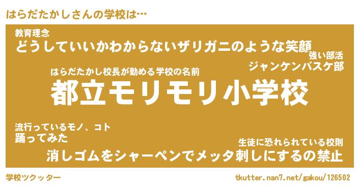 先生 はらだたかし先生が勤める学校名『市立肉球中学校