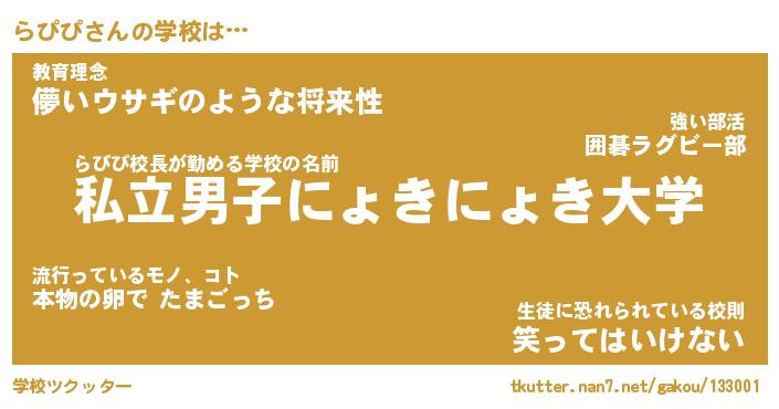 | 男性向けラノベタイトル風あだ名 | 『らぴぴの憂鬱』 |