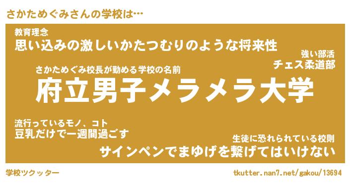 | 女子向けラノベタイトル風あだ名 | 『さかためぐみ姫と円卓の騎士』 |