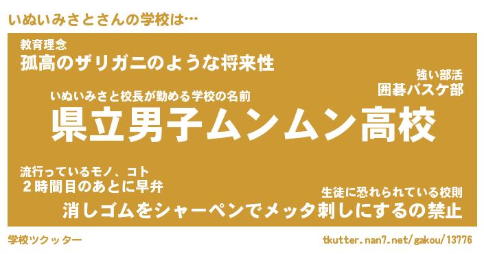 | 男性向けラノベタイトル風あだ名 | 『イヌイミサトアートオンライン』 |