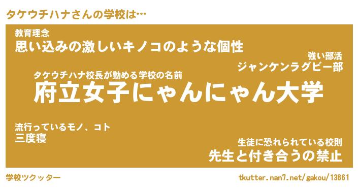 | ヒーロー風カッコイイあだ名 | 『スーパータケウチハナ』『暗黒騎士タケ』 |
