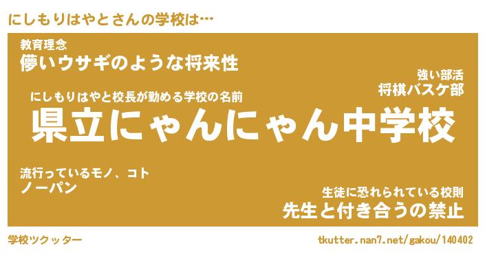 | 男性向けラノベタイトル風あだ名 | 『にしもりはやとの憂鬱』 |