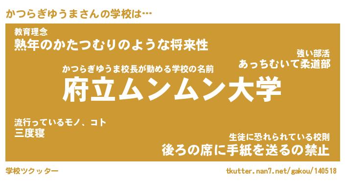 | 男性向けラノベタイトル風あだ名 | 『かつらぎゆうまの憂鬱』 |