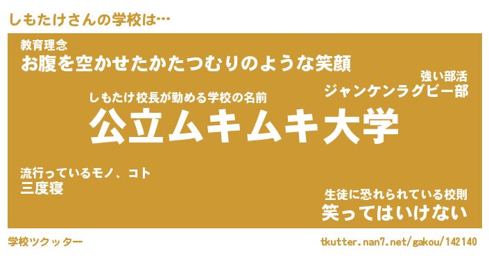 | 意味不明あだ名 | 『ペロリンしもたけ』『永久保存しもたけ』 |