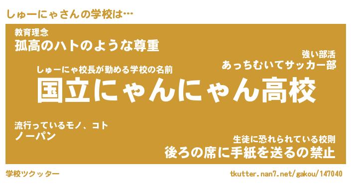 | 男性向けラノベタイトル風あだ名 | 『しゅーにゃの憂鬱』 |