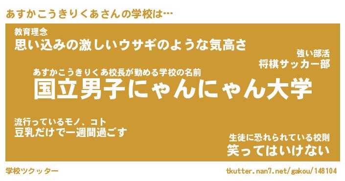 | 男性向けラノベタイトル風あだ名 | 『あすかこうきりくあの憂鬱』 |