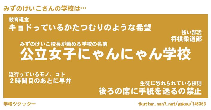 | ヒーロー風カッコイイあだ名 | 『スーパーミズノケイコ』『天弓騎士ミズ』 |