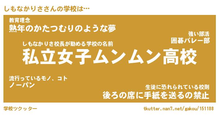 | ヘコむあだ名 | 『しもにゅー』『酢こんぶ』『しもを』 |