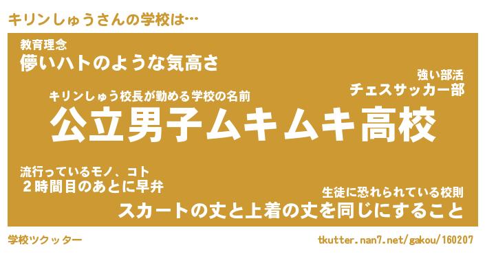 | 男性向けラノベタイトル風あだ名 | 『キリンしゅうの憂鬱』 |