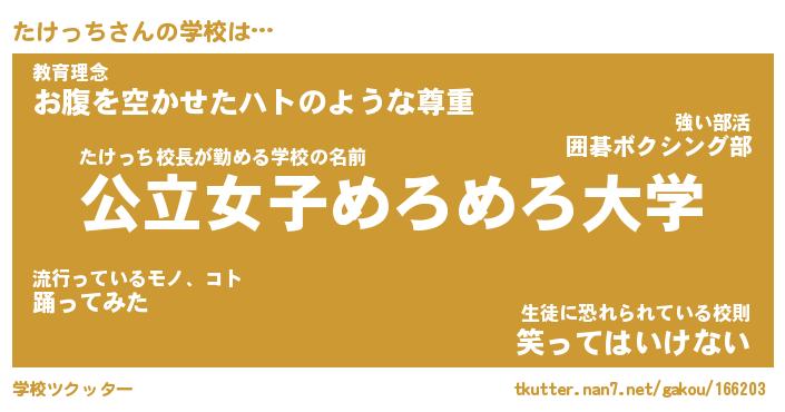 | 意味不明あだ名 | 『ペロリンたけっち』『永久保存たけっち』 |
