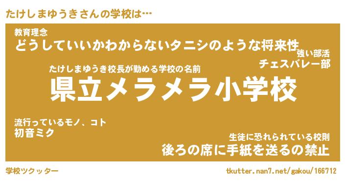 | 男性向けラノベタイトル風あだ名 | 『たけしまゆうきの憂鬱』 |