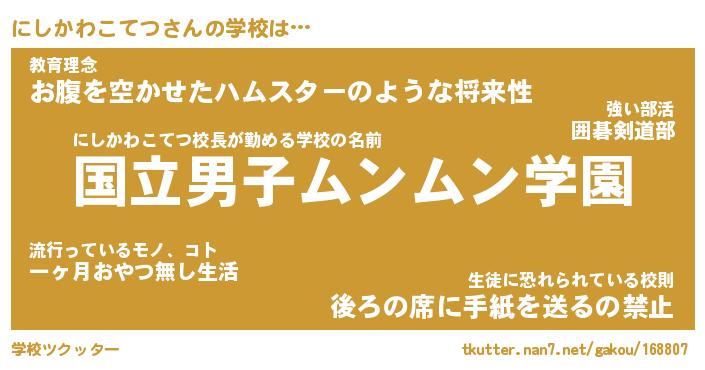 | 男性向けラノベタイトル風あだ名 | 『にしかわこてつの憂鬱』 |