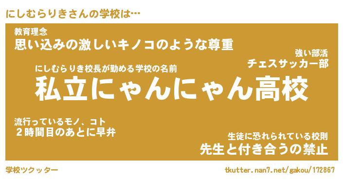 | 女子向けラノベタイトル風あだ名 | 『(仮)にしむらりきのやんごとなき事情』 |