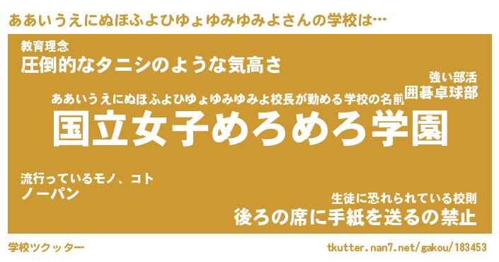 | 先生 | ああいうえにぬほふよひゆょゆみゆみよ先生が勤める学校名『町立しゃくれ小学校』 |