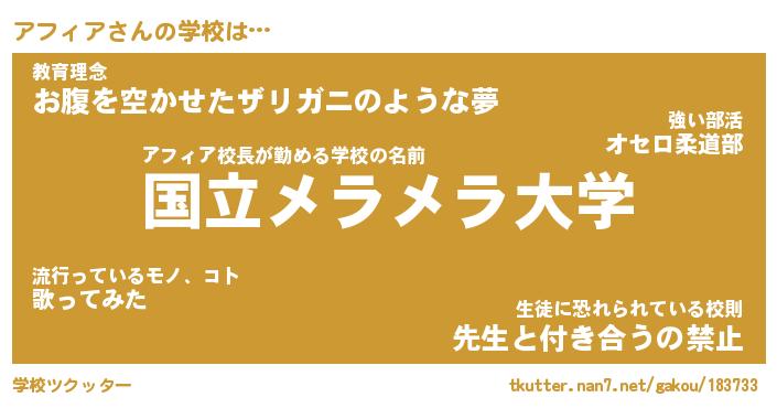 | 意味不明あだ名 | 『ペロリンアフィア』『永久保存アフィア』 |