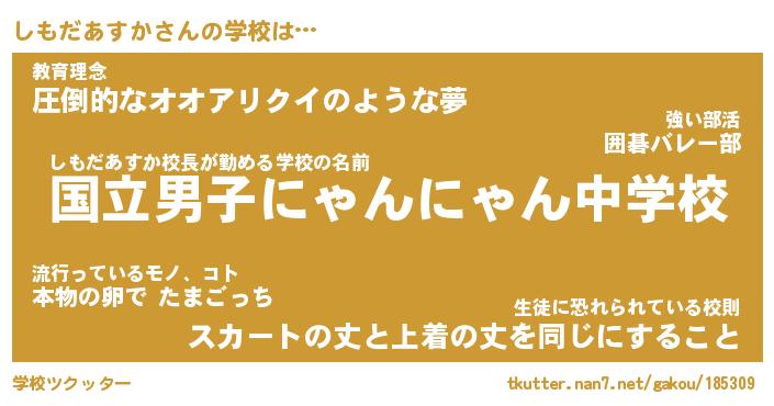 | ヘコむあだ名 | 『しももー』『牛乳』『しもっぺ』 |